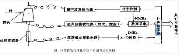 超聲波在球墨鑄鐵件中的傳播速度與球鐵本身的球化程度有一定的線性關(guān)系,即球化程度越好,超聲波傳播速度越高,反之則低。因此通過測量球墨鑄鐵的超聲波傳播速度就可以檢測其球化率。本檢測系統(tǒng)原理見下圖。